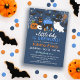 Blue Halloween baby shower invitation with a baby is brewing theme with a witch ghost, a cauldron brewing something blue and bubbly, a cat and pumpkin and skull, flying bats and mushrooms and spiders in a in blue. Boy Halloween baby shower invitation with a baby is brewing theme with spookily cute illustrations against a blue background.