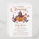 Cute "A Baby Is Brewing" Baby Shower design featuring a jack-o-lantern in a floppy witch hat surrounded by cupcakes, potion, lollipops and Halloween candy beneath the moon and stars. All that is needed is the Mom-to-Be to make this design complete. All text is in rose gold foil. Script text can only be edited by designer. Message designer if you need this modified. Composite design by Holiday Hearts Designs (rights reserved).