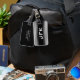 Masque de voyage monogramme masculin personnalisé. Design classique en motif rayé noir et gris avec nom monogrammé blanc lettres initiales. ie JFK Elégante idée cadeau pour les hommes. Combinaison de couleurs vives.