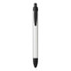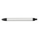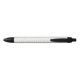 A ballpoint pen with a white, textured barrel and black accents on the tip, clip, and clicker. It is displayed in front and bottom views.