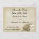 A beautiful tropical themed wedding Save the Date card for any happy couple planning a beach wedding. The back has "Love" written in the sand, with a heart that has an arrow through it below. On the front is an announcement of the bride and groom's names with the wedding date, which can be fully personalized. In the right hand corner is a golden seashell.