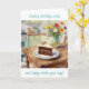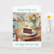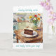 A birthday card for her with a sweet illustration of a piece of chocolate cake, pretty colorful flowers sitting on a rustic wood table in a cute cottage kitchen. This has a sweet sentimental message inside.