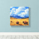 A beautiful landscape with two bison walking through a field of tall, golden grass. The sky is a brilliant blue with fluffy white clouds, and a distant mountain range with snow-capped peaks can be seen in the background. The overall impression is one of peace and tranquillity.