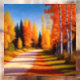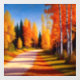 The colours in the picture are vibrant and rich, with warm oranges, yellows, and reds blending together to create a stunning autumnal palette. The birch trees are rendered in exquisite detail, with the white bark standing out in sharp contrast against the surrounding foliage. The painting has a sense of movement and life that is almost tangible, with the viewer feeling as if they are walking down the driveway themselves.
