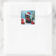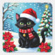 A cute black cat with a Santa hat sitting with a poinsettia flowers, a Christmas tree and snowflakes in blue and red holiday stickers.