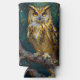 A beautiful personalized can cooler with a gold and blue owl sitting on a tree branch. This illustration has an impasto oil painting style.