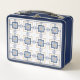 A blue and white metal lunchbox with a geometric pattern featuring star and cross shapes in a repeating design. The handle and latches are silver.