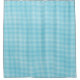 A blue checkered shower curtain is shown. The pattern is small squares in light blue and white. It's displayed hanging in a bright bathroom with white fixtures.