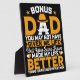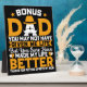 A heartfelt tribute to the incredible bond between a bonus dad and their child. This design beautifully acknowledges the role of a stepfather with a message full of gratitude, love, and humour. Featuring bold typography in white and orange, the words “BONUS DAD” stand out proudly, paired with a moustache and hat graphic that embodies wisdom and fatherly strength. The touching words express appreciation: “You may not have given me life, but you sure have made my life better. Thanks for putting up with my mom.” Small hearts and stars subtly enhance the emotional depth, making this the perfect way to honour a bonus dad’s unwavering support and love.