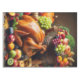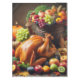 The image showcases a bountiful and festive Thanksgiving-style feast. The centerpiece is a perfectly roasted golden-brown turkey, its skin glistening enticingly. Surrounding the turkey is a cornucopia of fresh fruits and vegetables, including apples, grapes, oranges, plums, pears, kiwi, broccoli, and a pumpkin. A decorative urn overflowing with even more fruits, including bananas and pomegranates, sits behind the turkey. Adding to the autumnal ambiance are scattered leaves, pine cones, and a couple of ornate goblets, one filled with a golden beverage. The entire scene evokes warmth, abundance, and the spirit of celebration.