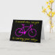 This silly birthday greeting card design features a silhouette of a bicycle, along with the message "A brand new bicycle is coming your way..." on the front. The inside features the message "You just need to go to the store and buy one for yourself! Happy Birthday!". This could be a funny card for somebody who likes biking and who is celebrating a birthday.