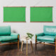A bright green screen set against a clean white ba hanging tapestry