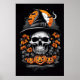 Dive into the heart of Halloween's dark enchantment with this mesmerizing poster! A fearsome skeletal witch, her eerie visage illuminated by an ominous glow, commands the night. Bats take flight across the moonlit sky, while a row of intricately carved pumpkins adorns the bottom, adding an extra layer of spooky delight.