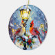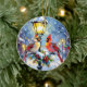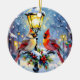 A beautiful Christmas ornament with an impasto style ai illustration of a female and male cardinal sitting on a lamppost on a snowy winter night. A back drop of a cute festive street and village. On the back of the ornament you can add your own custom message and family photo in the personalize area.
