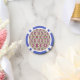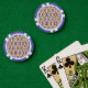 A casino chip features intricate floral patterns in pink, green, and purple on both sides, surrounded by a blue and white border, conveying elegance.