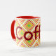 Large designer coffee mug, yellow, green, burgundy and red. Text can be personalized with a name, or text is also removable, to suit your kitchen style.