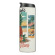 This collage features a refreshing summer theme, centred around a tropical drink with pineapple slices. The background is divided into four panels depicting classic beach scenes: a golden sunset, a crashing wave, a pier, and a beach with palm trees and a sunhat. The art has a vibrant, vintage look with a distressed border and the words "Summer Vibes" at the bottom.