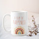 A beautiful gift for tea and coffee lovers! Simple, modern typography with the words "A CUP OF HAPPINESS" and a boho rainbow graphic in earthy tones.