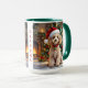 An adorable personalized Christmas coffee mug with a festive poodle sitting in front of the fireplace on a cold winter day. A Christmas tree decorated and a festive background.
