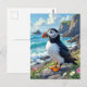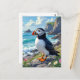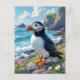 A beautiful vibrant colourful ai illustration of a puffing watching the ocean waves by the sea shore surrounded by rocks, dunes and flowers on a postcard just to say hi and keep in touch with a friend or family member.