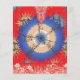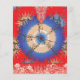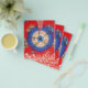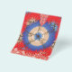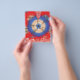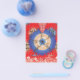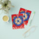 The design features a stunning fractal pattern. At the centre, there’s a circular motif in blue and white, surrounded by intricate designs in shades of orange, brown, and blue. The background is a rich red with gold star-like patterns scattered throughout. This symmetrical fractal design is visually captivating and often symbolizes infinite complexity, whether in mathematics, nature, or art.