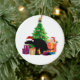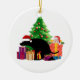 A playful Christmas ornament featuring a mischievous dog wearing a Santa hat, leaving a little 'gift' amongst the presents beneath a beautifully decorated Christmas tree. Santa himself is peeking out of a giant present, witnessing the cheeky scene.