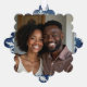 Dual-Panel Design: This keepsake is truly special, combining two scalloped snowflake panels that fit together beautifully. One panel displays your favourite photo—a candid shot of the family, a sweet couple's picture, or a fun photo of the kids. The other panel features a stylish, pre-designed holiday greeting in a festive blue and white snowflake pattern that says "MERRY CHRISTMAS & HAPPY NEW YEAR" and includes a space for your custom family name.