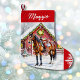 Jolie réserve de Noël personnalisée avec l'illustration d'un cheval brun debout devant une magnifique grange rouge ornée de lumières de Noël et d'une couronne festive pendant une journée d'hiver enneigée.
