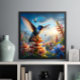A vibrant painting captures a colourful hummingbird gracefully flying over a field of blooming flowers. The birds iridescent feathers glisten as it hovers above the delicate petals.