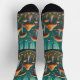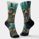 These crew-length socks echo the fantastical forest scene from the socks. On a light-coloured background, a mesmerizing web of glowing mycelium threads spreads across the foot, mimicking the fairy ring formation. Pops of colour peek through the webbing, hinting at the vibrant mushrooms hidden beneath the forest floor. As the socks climb the calf, einzelne [individual] bioluminescent mushrooms can emerge, casting an ethereal glow.