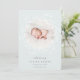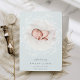 Elegant birth announcement in soft colours features a round newborn photo encircled by a wreath of white botanical branches and leaves, with "introducing [Name]" at the bottom in chic grey lettering. Personalize with baby's birthdate, and birth stats beneath, and add a personal message to the back, along with an additional photo.