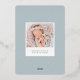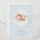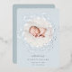 Elegant birth announcement in soft colours features a round newborn photo encircled by a wreath of silver foil botanical branches and leaves, with "introducing [Name]" at the bottom in chic grey lettering. Personalize with baby's birthdate, and birth stats beneath, and add a personal message to the back, along with an additional photo.