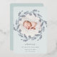 Elegant birth announcement in soft colours features a round newborn photo encircled by a wreath of silver foil botanical branches and leaves, with "introducing [Name]" at the bottom in chic grey lettering. Personalize with baby's birthdate, and birth stats beneath, and add a personal message to the back, along with an additional photo.