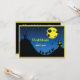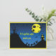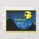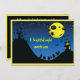 This image features halloween. A house is lit up by a full moon. The bats are flying around the house. The witch is flying on her broomstick and the monsters are running towards the house for the party. The graveyard and dead tree is on the hill overlooking the house. A yellow border was added. The back of the invitation is able to be customized with all your information.