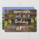 A fun rustic birthday invitation with a wooden fence and foliage. Add name to the front. The backside is a fun illustration of an outdoor setting with party info.