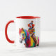 A funny clown riding a multicolored horse. mug