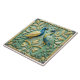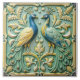 A square tile with a light green background, featuring two peacocks facing each other, surrounded by ornate floral designs. The peacocks are depicted in a stylized, relief-like manner, with one peacock primarily blue and yellow, and the other a mix of blue and green.