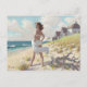 Classic PinUp card showing a beautiful PinUp Girl in a white bikini posing at the beach, painted by Arthur Sarnoff (1912-2000)