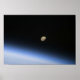 A gibbous moon visible above Earth's atmosphere featured with atmosphere.