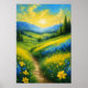 Transform your space with the captivating allure of a poster showcasing a vivid digital artwork. A picturesque scene unfolds: a lush green valley adorned with a carpet of blue and yellow flowers. This poster captures the harmony of colours in nature's embrace, inviting you to immerse yourself in the tranquil beauty of a blooming paradise.