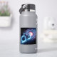 An illuminated bicycle races through a swirling cosmic tunnel filled with vibrant colours and dynamic patterns.