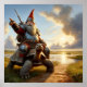 This captivating fantasy artwork features a robust dwarf warrior, wearing battle gear, resting beside his fierce companion. Set against a breathtaking landscape of serene rivers and dramatic skies, this duo embodies both strength and camaraderie. Perfect for lovers of fantasy, mythology, or anyone seeking a whimsical yet epic piece for their space.