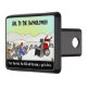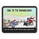A trailer hitch cover with a funny cartoon about worshiping a snowblower. Original artwork by DB Cartoons.