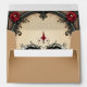 A gothic romance. An ornate, gothic-style frame surrounding a beige background. Red roses with dark green leaves are arranged around the frame, particularly in the corners. At the bottom centre, there is a decorative heart-shaped emblem with the word "LOVE" inscribed in a stylized font.