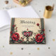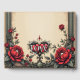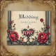 A gothic romance. An ornate, gothic-style frame surrounding a beige background. Red roses with dark green leaves are arranged around the frame, particularly in the corners. At the bottom centre, there is a decorative heart-shaped emblem with the word "LOVE" inscribed in a stylized font.