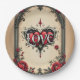 A gothic romance. An ornate, gothic-style frame surrounding a beige background. Red roses with dark green leaves are arranged around the frame, particularly in the corners. At the bottom centre, there is a decorative heart-shaped emblem with the word "LOVE" inscribed in a stylized font.