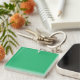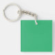 a green background with a white border keychain
