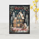 A greeting card of houses and trees with snow and stars in the background. The background is a dark smokey blue. The words Merry Christmas are done in a red colour.