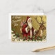 This design features a repeating Christmas pattern that looks like old-fashioned wrapping paper. It displays classic pictures of Santa Claus in his red suit standing next to a reindeer, along with large green holly wreaths tied with red ribbons that circle a snowy winter scene. The design is filled with traditional holiday details like lit candles, scrolls with greetings like "A Happy Christmas Tide," and warm colors that create a cozy and festive feeling.