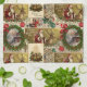 This design features a repeating Christmas pattern that looks like old-fashioned wrapping paper. It displays classic pictures of Santa Claus in his red suit standing next to a reindeer, along with large green holly wreaths tied with red ribbons that circle a snowy winter scene. The design is filled with traditional holiday details like lit candles, scrolls with greetings like "A Happy Christmas Tide," and warm colors that create a cozy and festive feeling.